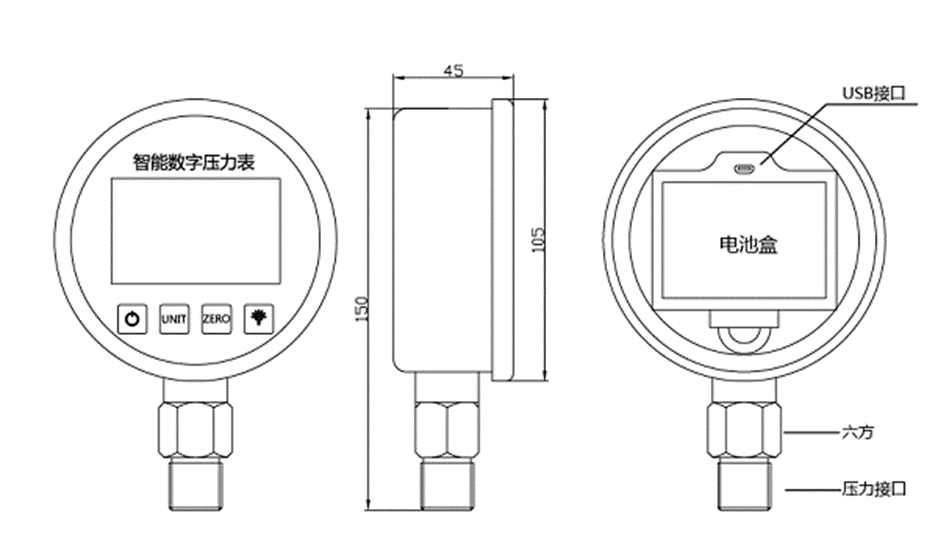 SUAY80電池供電壓力表是一款高精度智能型數(shù)字壓力表,內(nèi)置高精度壓力傳感器,能夠準(zhǔn)確的實(shí)時顯示壓力,并且具有精度高、長期穩(wěn)定性好的特點(diǎn)。配備5位顯示的大尺寸LCD液晶顯示,具有清零、背光、開關(guān)機(jī)、單位切換、低電壓報警、峰值記錄等多種功能,操作簡單,安裝方便。殼體和接頭采用304不銹鋼,抗震性好,能夠測量氣體、液體、油等對不銹鋼無腐蝕的介質(zhì)。用3節(jié)5號電池供電,也可以采用USB供電,續(xù)航功耗低、時間長,適用于便攜式壓力測量、設(shè)備配套、校驗(yàn)設(shè)備等壓力測量領(lǐng)域。